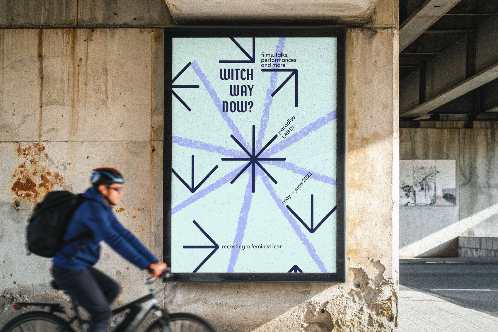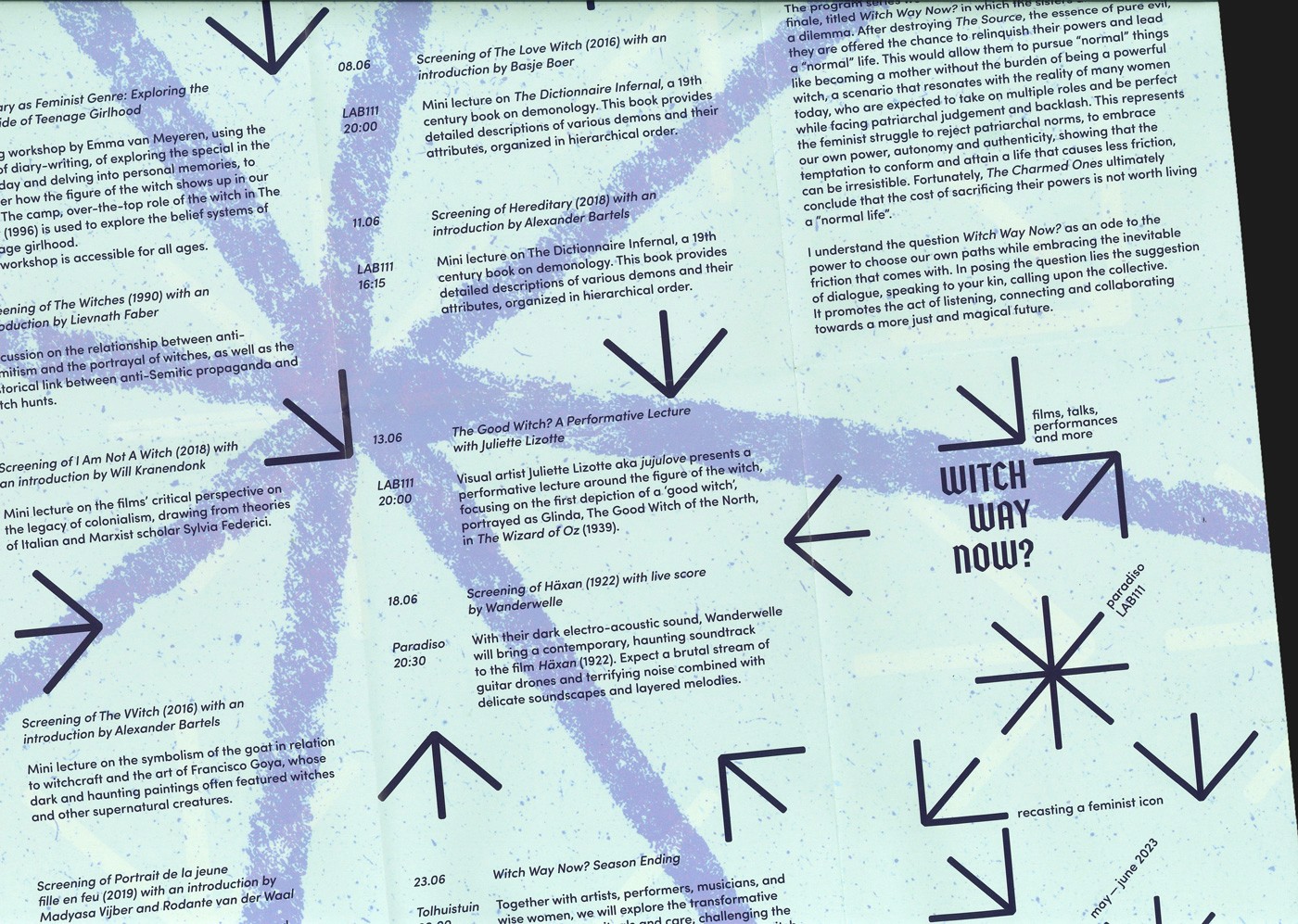 Witch Way Now? is a program developed by Helena Castro from Paradiso, in collaboration with movietheatre LAB111. This program delves into the witch as a feminist icon, examining her various representations. The goal is to move towards a more positive and inclusive depiction of witches and craft a compelling identity for this program based on the significance of circles within witchcraft and a positive/negative contrast.